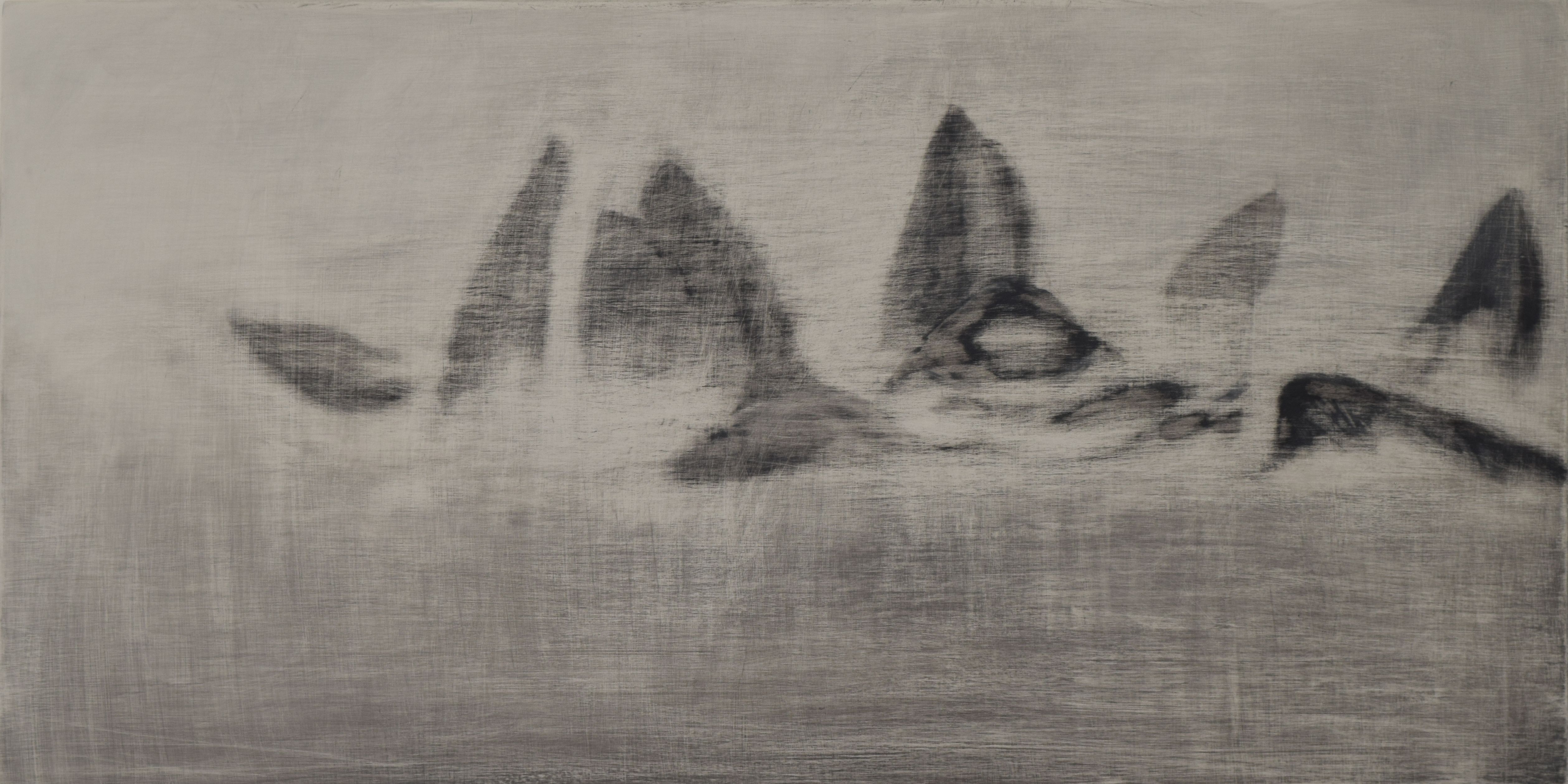 This series of oil paintings explore the abstract shape of whales as they emerge from the ocean. Without reference to scale, they question our imagination—morphing between creature and landmass—and then slip away without leaving a trace.
