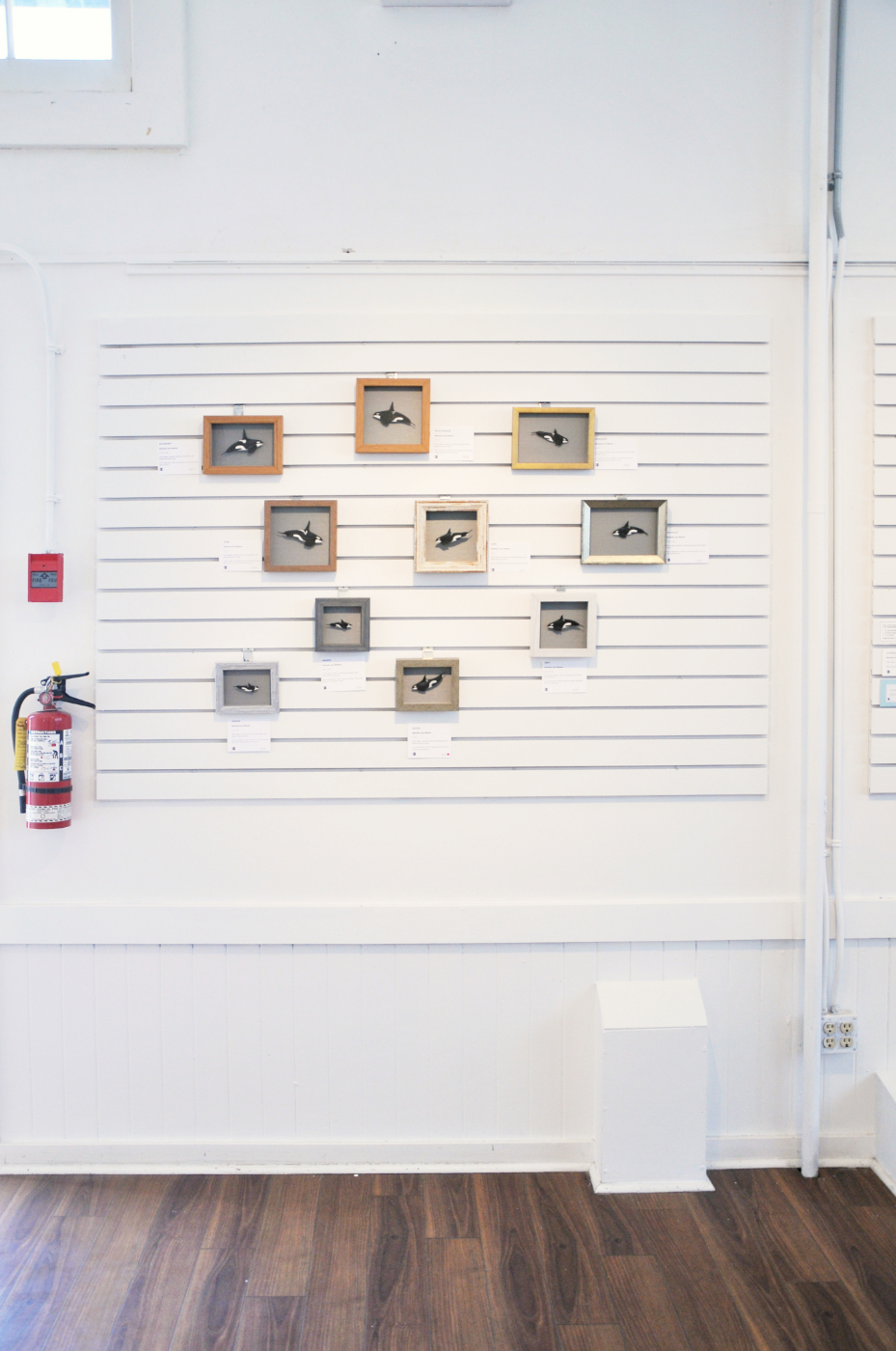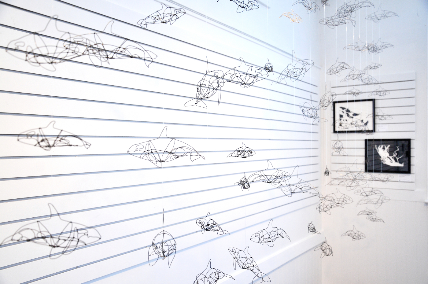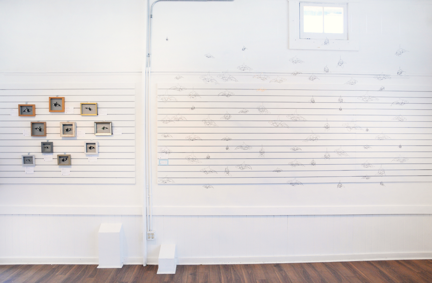 This exhibition contains a collection of small ink drawings in shadow boxes. Influenced by museum displays and zoological drawings, these works bring attention to the individual—showing the unique physical differences between Southern Residents. This collection represents specific members and shows the variations in their saddle patches, the white/grey markings on their backs, aiding researches in orca identification. The drawings are suspended like scientific specimens, bringing attention to their delicacy and giving them the appearance of swimming.