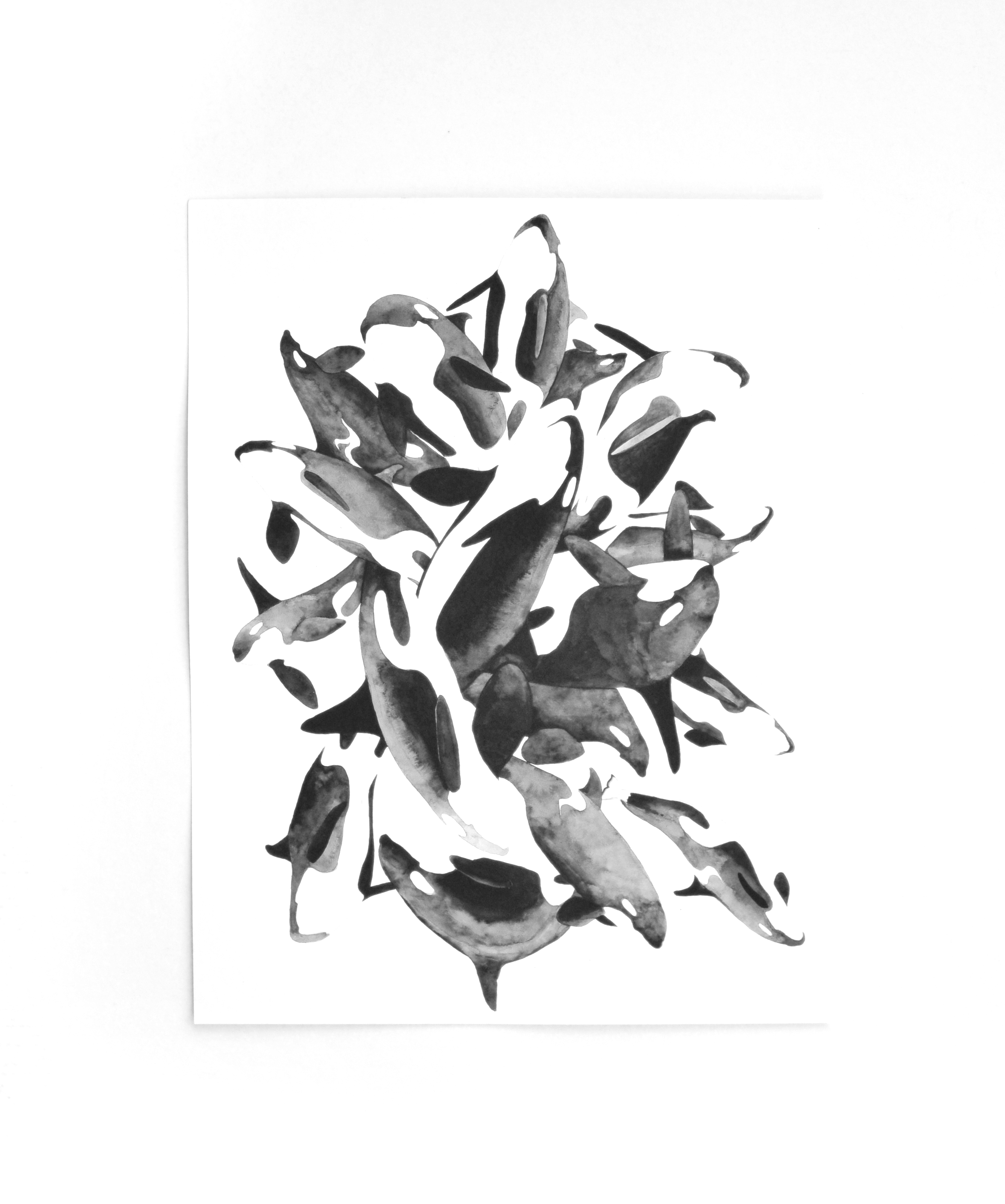 The three black and white drawings of orca clusters are made with gouache, an opaque watercolour-like medium. Each orca represented in these drawings is mid breach. The behaviour of breaching involves an incredible amount of energy as they leap mostly or fully into the air. Researchers wonder why individuals do this and have a variety of theories, including: the possibly of it being a social behaviour, to make a loud sound that travels farther underwater, to rid themselves of parasites, or potentially an act of play. Like a splash, these drawings also radiate from the centre, creating a sense of movement and activity.