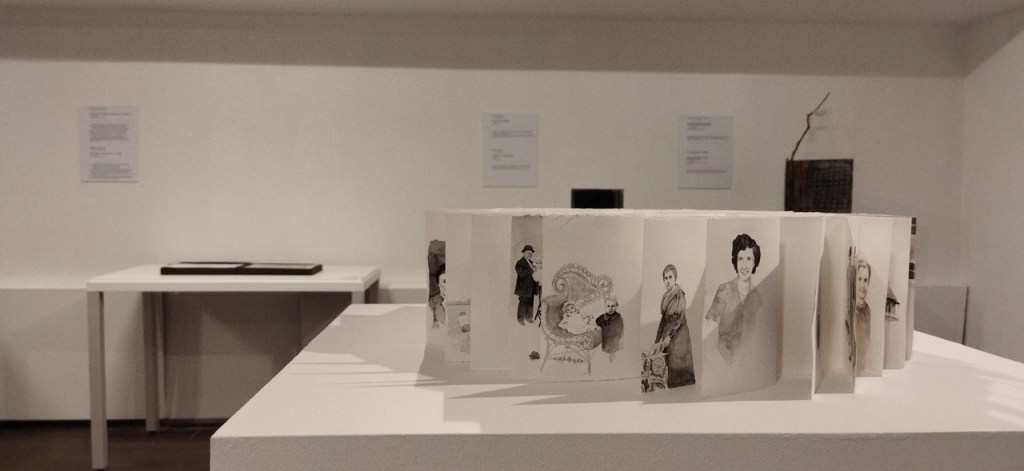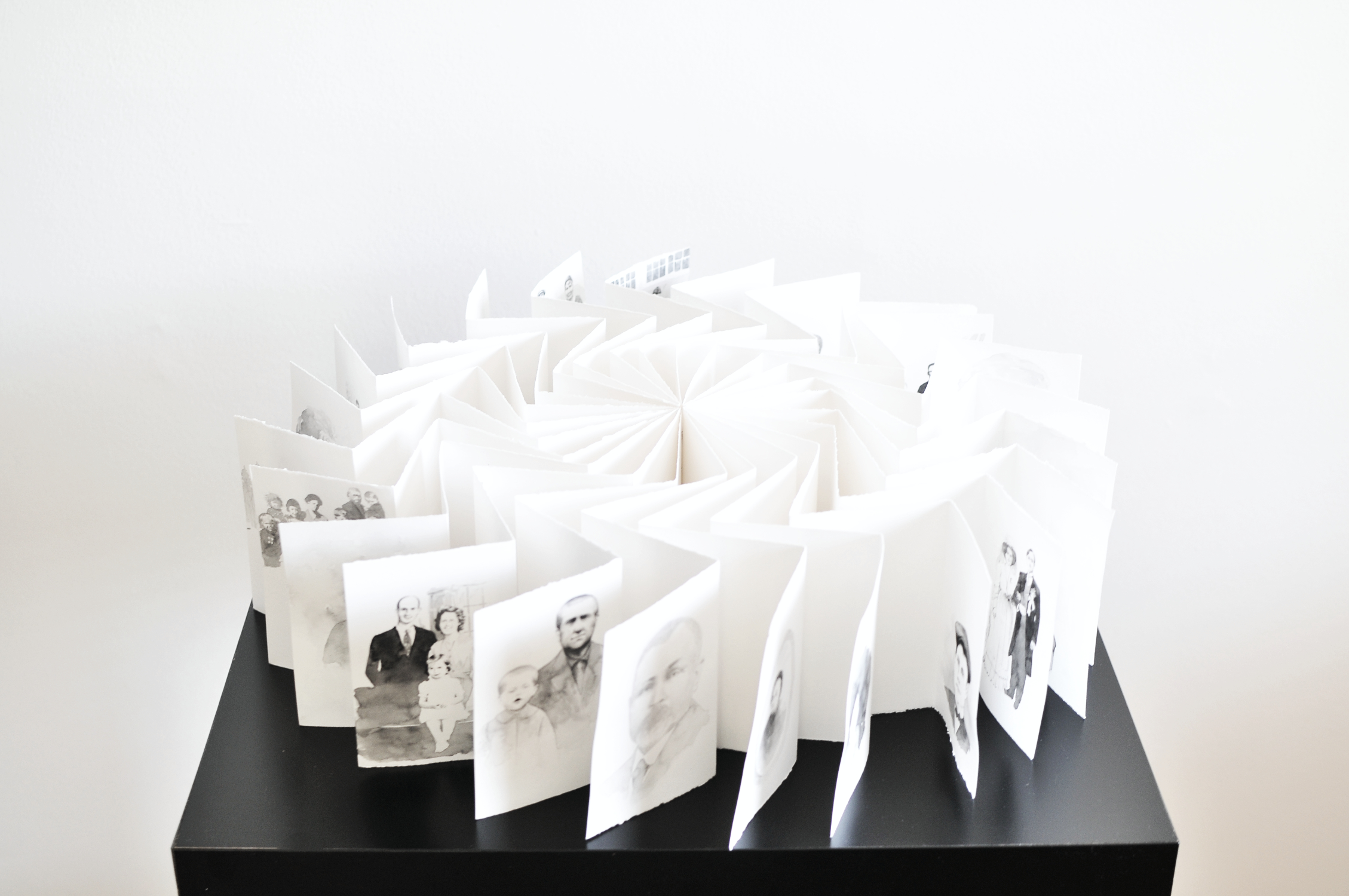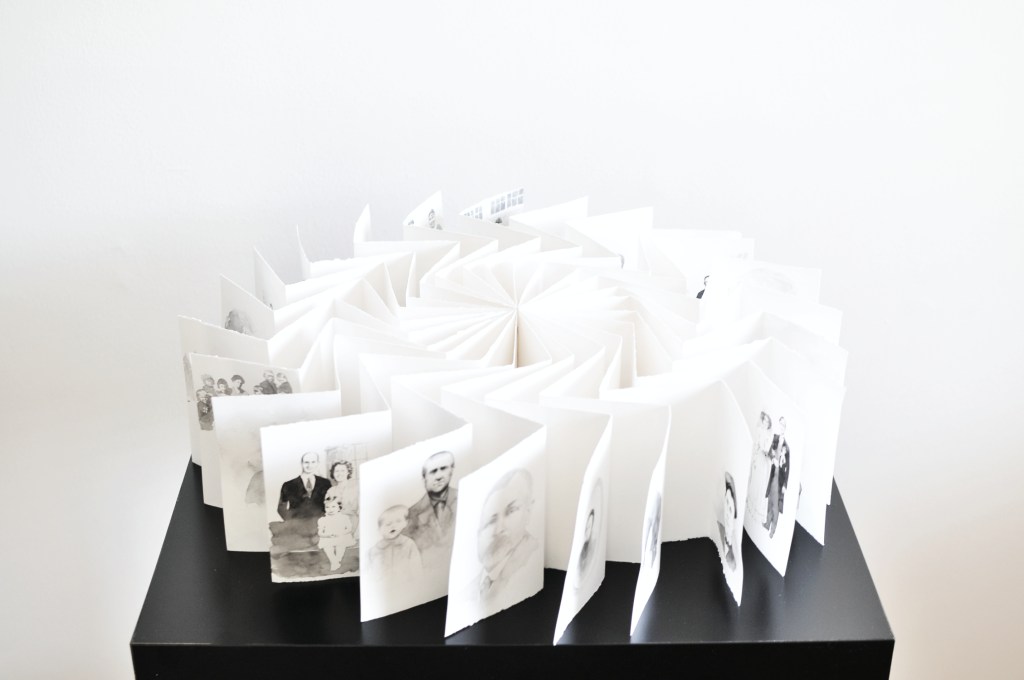 This exhibition was titled Biblio Nordica (book of the north). The original concept was twofold: it focused on the connections between countries that share similar geographical latitudes and asked artists to consider creating art within the open-ended framework of a “book”. I was surprised to be included in this show as I had not previously considered myself from the north as I live in one of the most southerly locations in Canada. However, I am from the north in a global context. The other artists in the exhibition were from Russia, Finland and Norway. When I was contemplating how to begin this project, I kept thinking about my ancestors’ connection to the north. Since leaving their native country about 400 years ago, and settling across three continents, my ancestors called many places home—but all between the 50th and 60th latitude lines. Books are among the most prized and treasured objects in history. Books have been stolen, burned and smuggled. They can be illuminated in gold, embossed, stamped, chiseled, typed or written by hand. But they can also be humble, everyday objects that tell personal stories and communicate ideas. I quickly came to realize that a “book” can be quite an open expression. Just think of the variety of forms: unfurling scrolls, loose tablets, bound into blocks and so on. The purpose of a book is to communicate, and that doesn’t have to be restricted to what is on the pages. Meaning can be incorporated into the form itself. I created my “book” so that when it is viewed from above, it’s form references a diagram of the northern part of the globe.