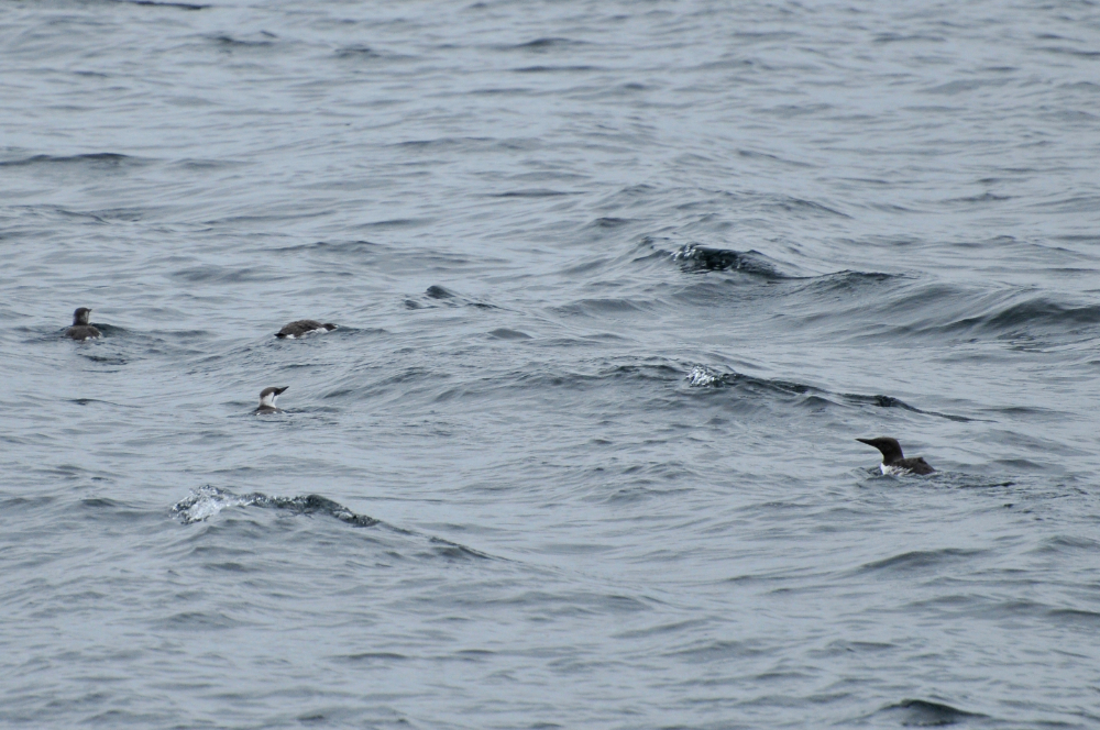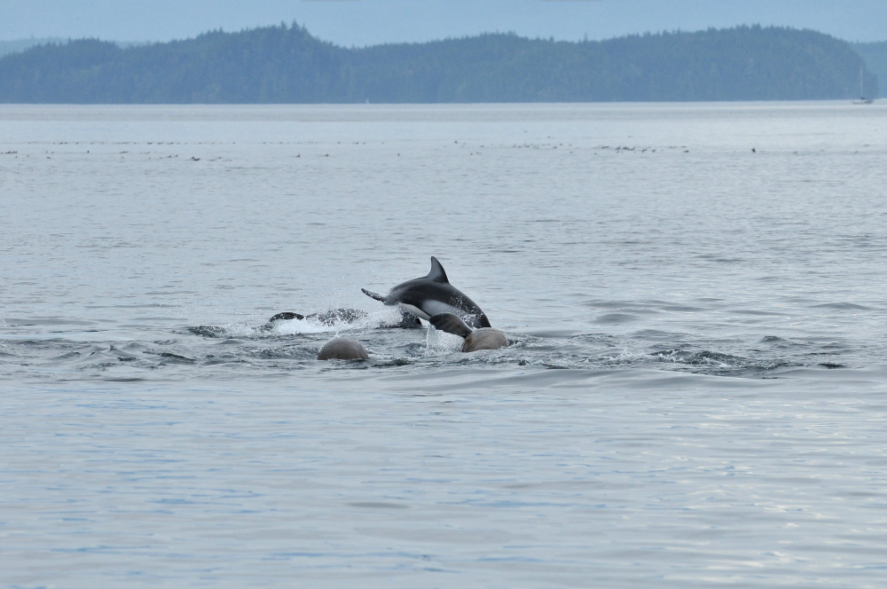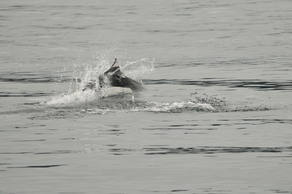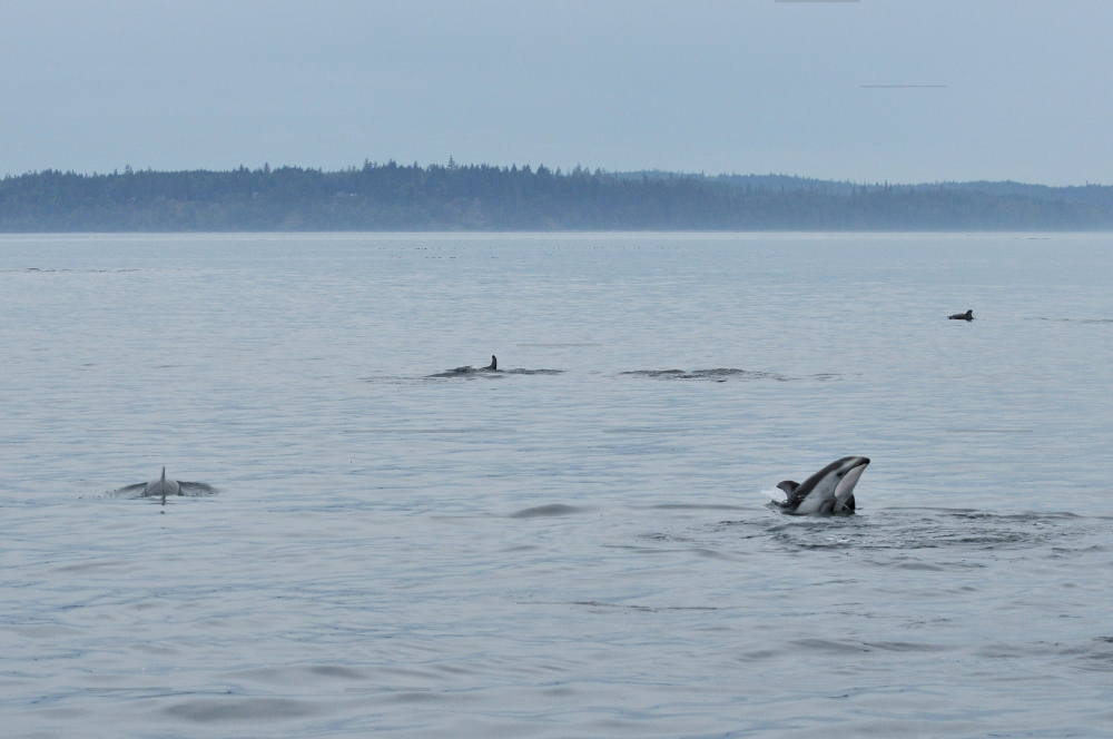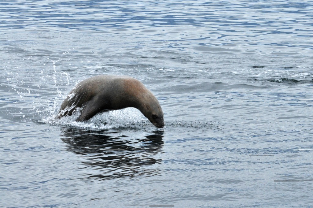 There was a point along our trip when we were stopped and watching some humpbacks feeding, when the water started to practically boil with activity. Pacific white-sided dolphins! They were very active and, like the humpbacks and birds, ready for a hearty dinner of fish. They were doing something called “porpoising”, which means that they were leaping out of the water as they swam. As I stood there in awe, trailing them with my camera lens I caught a blur of brown. What? A brown dolphin? No. It couldn’t be. Could it…..? It flashed by again! A pair of huge sealions! And yes, they were swimming with the dolphins. Rolling around each other and….yup! They were porpoising too! According to estimates of the crew, there were possibly around 100 dolphins (and two rather outgoing sea lions).