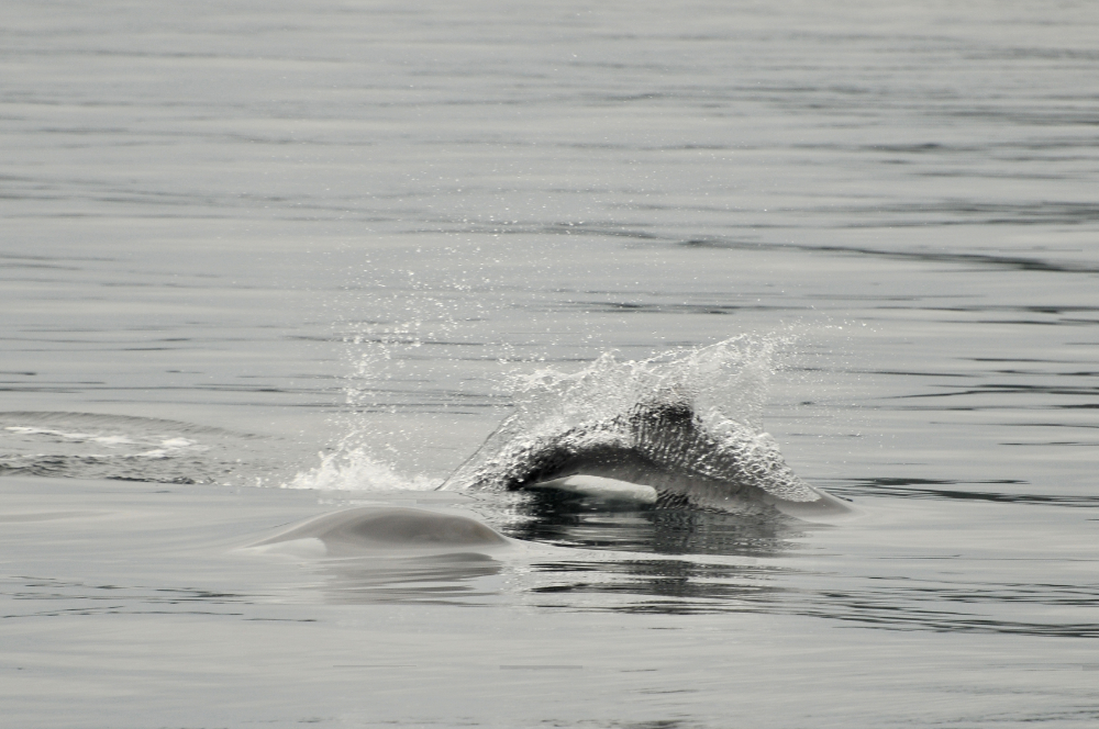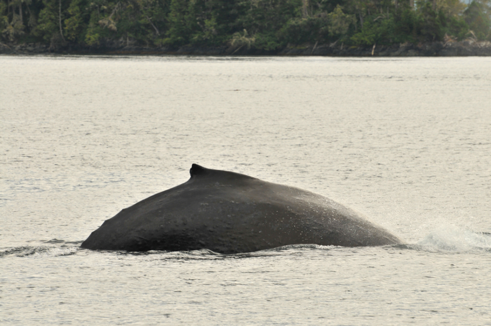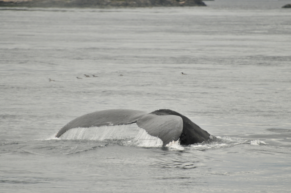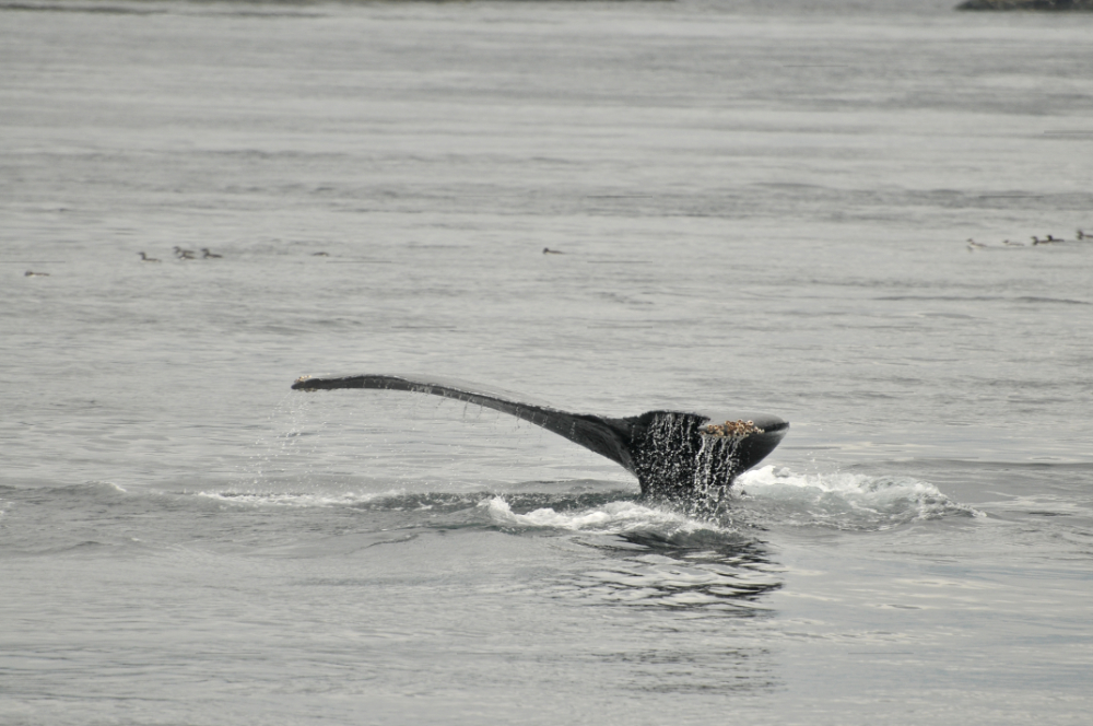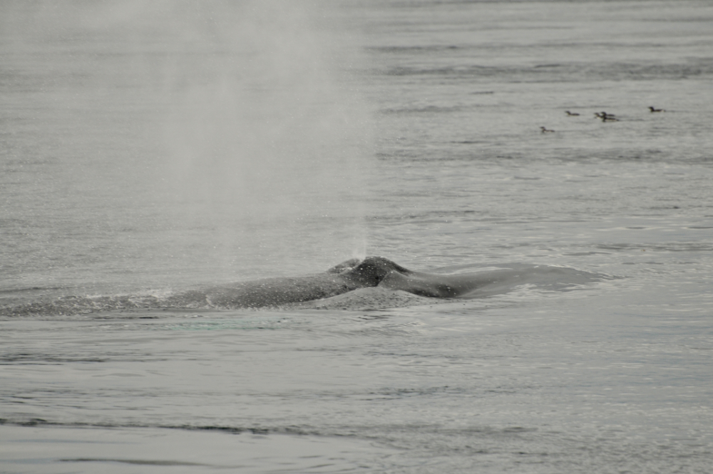 And speaking of porpoises…. this leads me to the next cetacean species that we encountered. Years ago I was reading about a specific species of porpoise that is a blocky, funny-looking creature. Apparently, when they surface, they look like a rotating square. Ever since I read this description, Dall’s porpoises have been on the very top of my Cetaceans I Want To See List. I could not believe my eyes! These little speed devils zipped around so fast. Splashing, rotating square porpoises! I am not sure how many there were…. maybe about 5 or 6. They were closely escorting a humpback by the name of Ridge (BCX1249)…. much, it seemed, to his aggravation. I am not sure why they were hanging out to closely to him, but he seemed to not particularly enjoy the attention. At one point he surfaced and gave an auditable exasperated sound when he exhaled. This behavior is called trumpeting. I have read about this, so it was amazing to actually hear it. We saw Ridge a few more times a little later on… still surrounded by his edgy entourage.