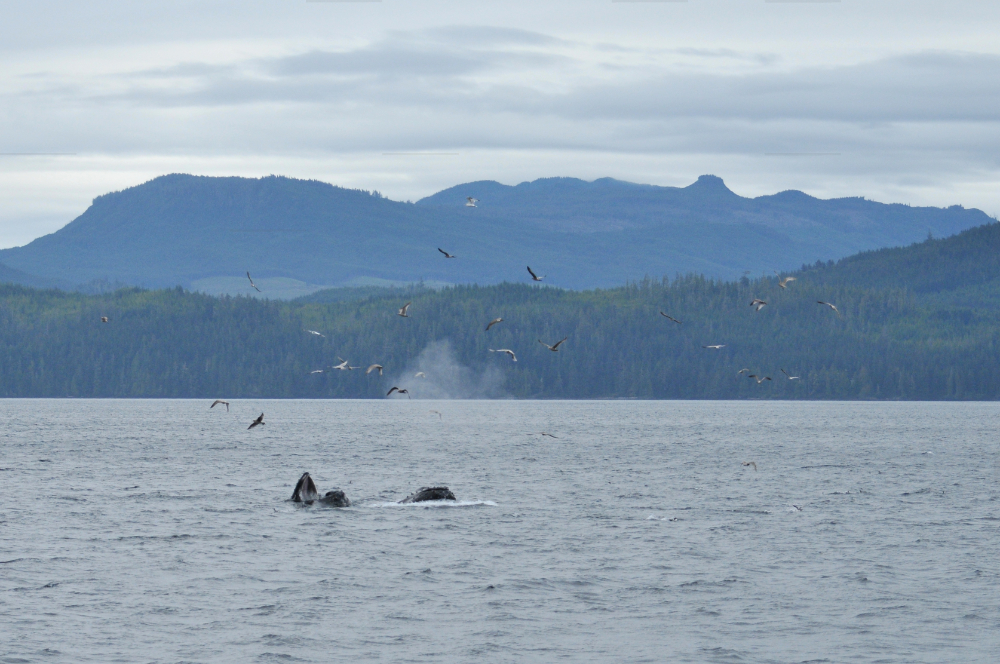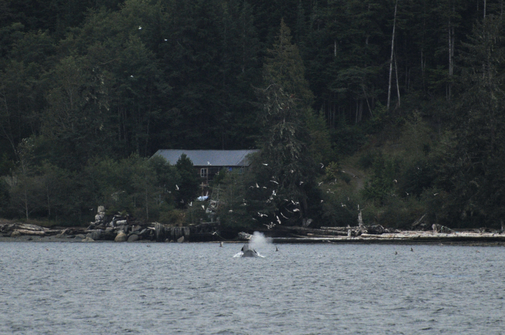 You were probably wondering if I was ever going to show you pictures of whales. Well, here they are. And not just any whales, humpback whales! As adults, these giants can grow up to 14-17 meters in length and weigh up to 40 tonnes. I have already mentioned a few things about humpbacks above, because it is hard to talk about one species without mentioning the ones around it. Humpbacks, like many other large whale species, were heavily whaled along BC’s coasts. This came to an end in 1964. The humpback population has taken a long, slow path to recovery. When MERS started cataloging humpbacks along the north coast of Vancouver Island in 2004 they were not spotted regularly but the numbers have been greatly increasing since then. Here is an interesting article by CTV News interviewing Jackie about the “humpback comeback”. Like the sea otters, it is encouraging to hear about these populations that were pushed to the brink of extinction and have somehow managed to bounce back. Many of the humpback whales we observed were feeding on large groups of small fish with the changing tide. We watched two different types of feeding strategies be employed by humpback whales: lunge-feeding and trap-feeding.