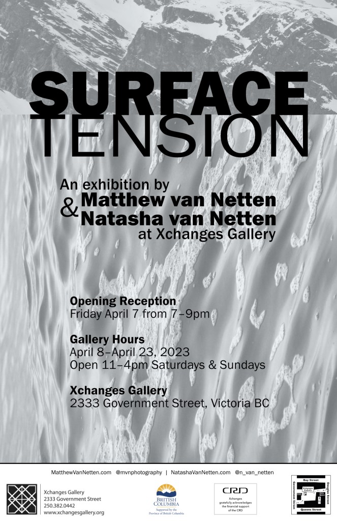 Throughout our relationship, we have had the unique opportunity to live and work in the mountains of Jasper National Park and on a sailing vessel in the Mediterranean Sea. These experiences of inhabiting immense and often daunting natural spaces have given us a deep respect for the power of nature. Our conversations about these experiences have led us to create SURFACE TENSION.