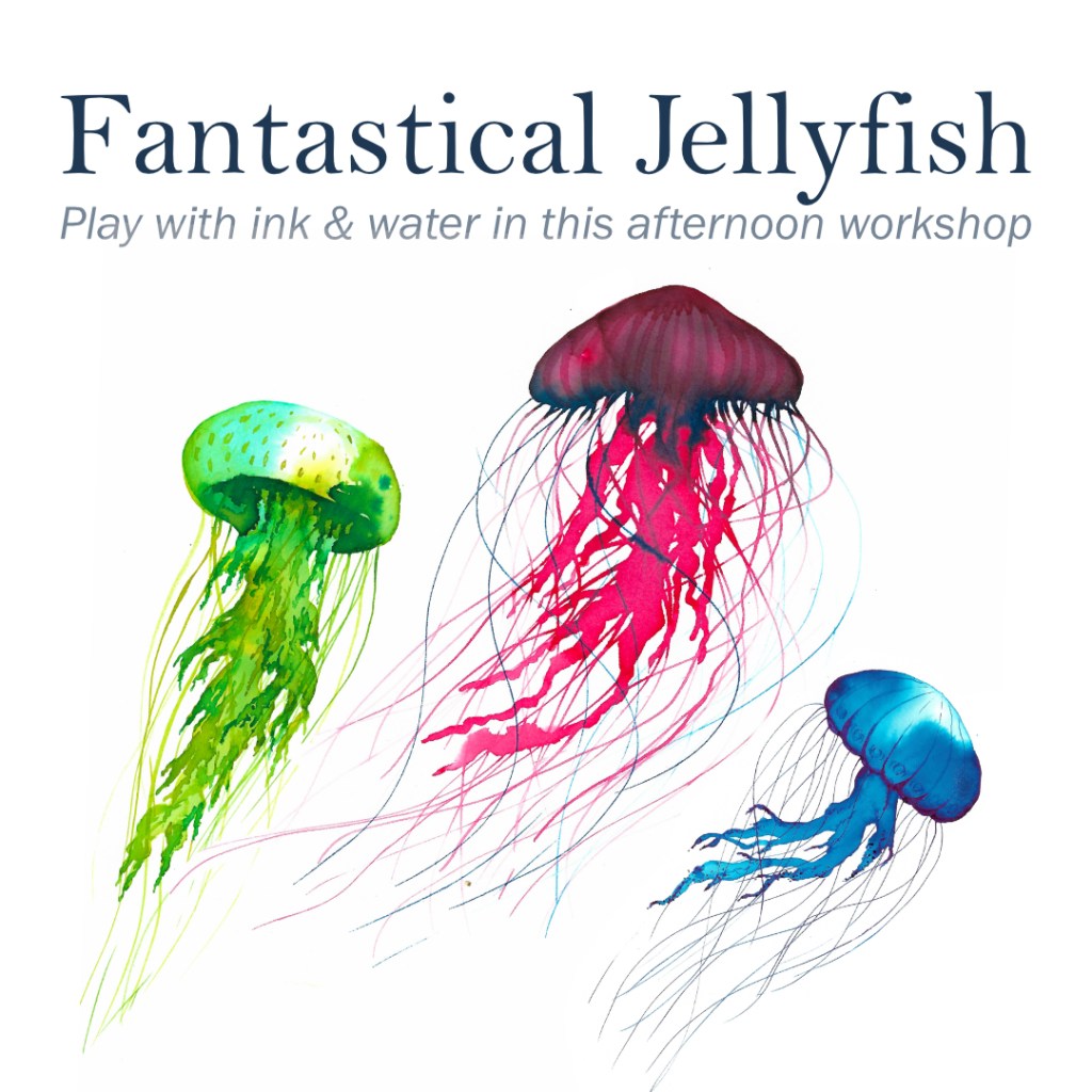 You will discover many playful ways to use ink while drawing and painting jellyfish in this afternoon workshop. These ethereal creatures are made of 95% water, which is why the liquid quality of ink works so well to express their forms. Ink and water can be challenging to control—wanting to bleed, flow, run and drip. Learn how to use these characteristics to create interesting and surprising artworks. In this workshop you will discover new approaches to artmaking that can be applied to a variety of aquatic life. Suitable for all levels. All supplies included. Click here for more info & to register