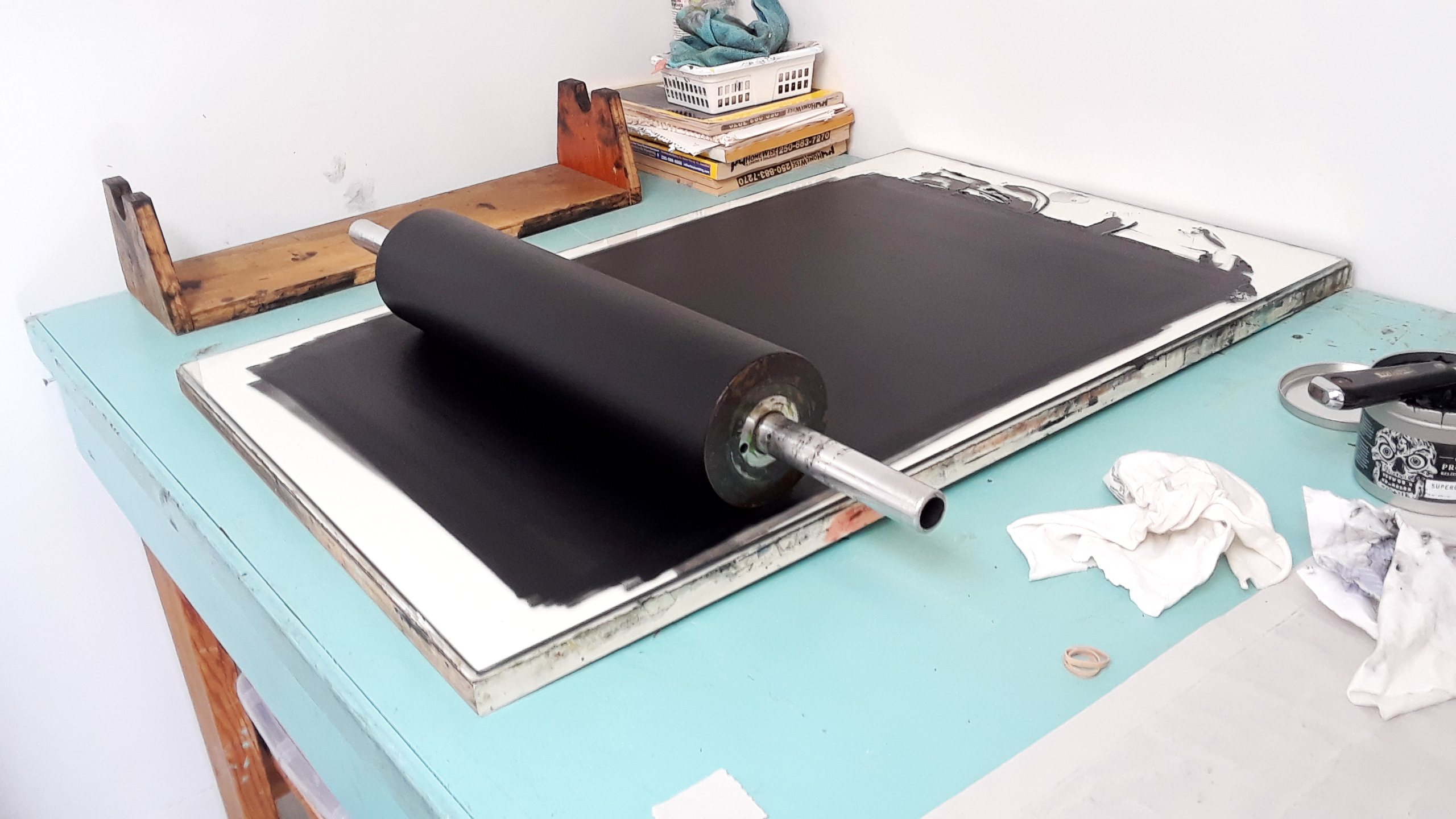 Then there is the inking of the plate. Again, sounds fairly straight forward, but I quickly learned this means more than just coating the block with ink. When you load the roller, one must lift the roller between going back and forth to allow the roller to spin and get even coverage. To load it properly there is a particular sound you want the ink to make as the roller passes over it and a special texture/gloss that you are looking for. Again, it comes back to getting the “feel” for it. This took me a few days before getting comfortable recognizing the signs.