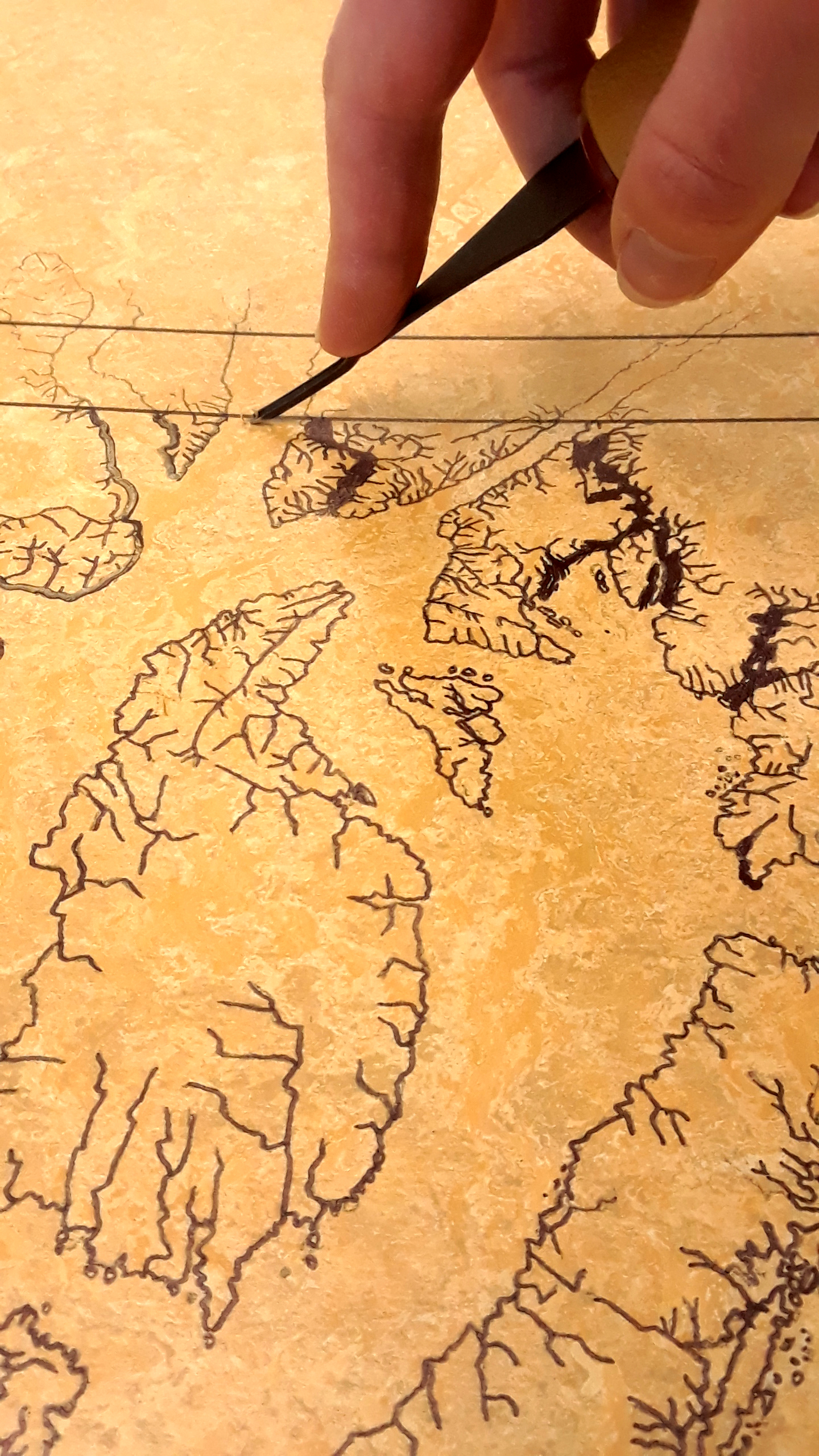 I cut my lino block to size with a utility knife so it would be easier to handle and then started carving. It was tough work and I quickly realized how important it is to sharpen the carving tools often. This process is labour intensive and it took me a few months to complete (among my other projects). I started by edging around the land forms and then carving out, into the water areas. Once everything was roughly carved, I then went back again, and again, to continue smoothing out ridges and bumps. The final steps were to complete the small boarder around the edge, cut away the excess lino around the sides and carve away the delicate river systems that lead to the ocean. Carving is hard work and it is important to take breaks for your hands and wrists. When the lino is warmer it becomes softer and easier to cut.