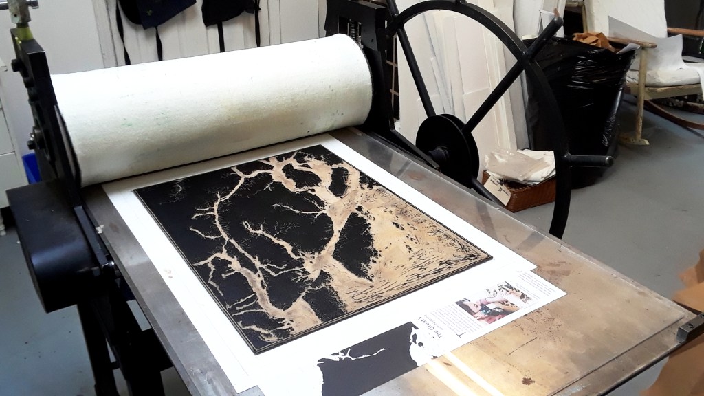 Once the plate was complete, I created a test print to check and see if any areas required more carving. After making the final adjustments to the carved lino plate, I was ready to move into the printing studio. I am incredibly grateful to Alison, Desiree and Tara, the founders of PRINT, for their support, for getting me get set up in the studio, for assisting me with the printing process and for sharing their knowledge and printing passion with me.