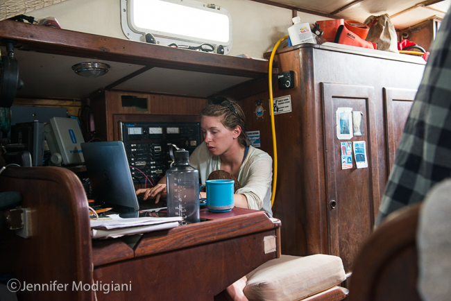 Dominica Sperm Whale Project, Christine at the navigation table. Photo credit Jennifer Modigiani