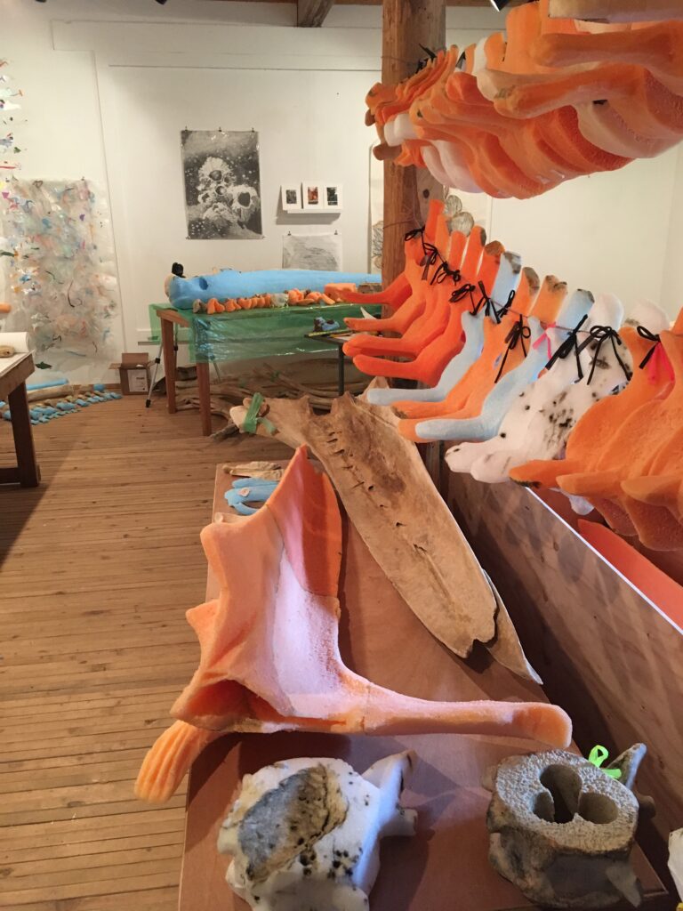 A year ago, before life had changed, I was invited to participate in an exhibition about humpback whales in Whitehorse, Yukon (Canada). I had the opportunity to meet one of the organizers, visual artist Joyce Majiski, and tour her studio residency on Salt Spring Island. The studio was full of drawings and paintings of whale bones, source/reference material, tools, a pile of colourful and worn Styrofoam and large vertebrae delicately placed here and there. In the centre of the room, between a couple pillars, were ropes suspending two sequences of orange and blue vertebrae. It was a creative space turned research lab. I was in heaven.